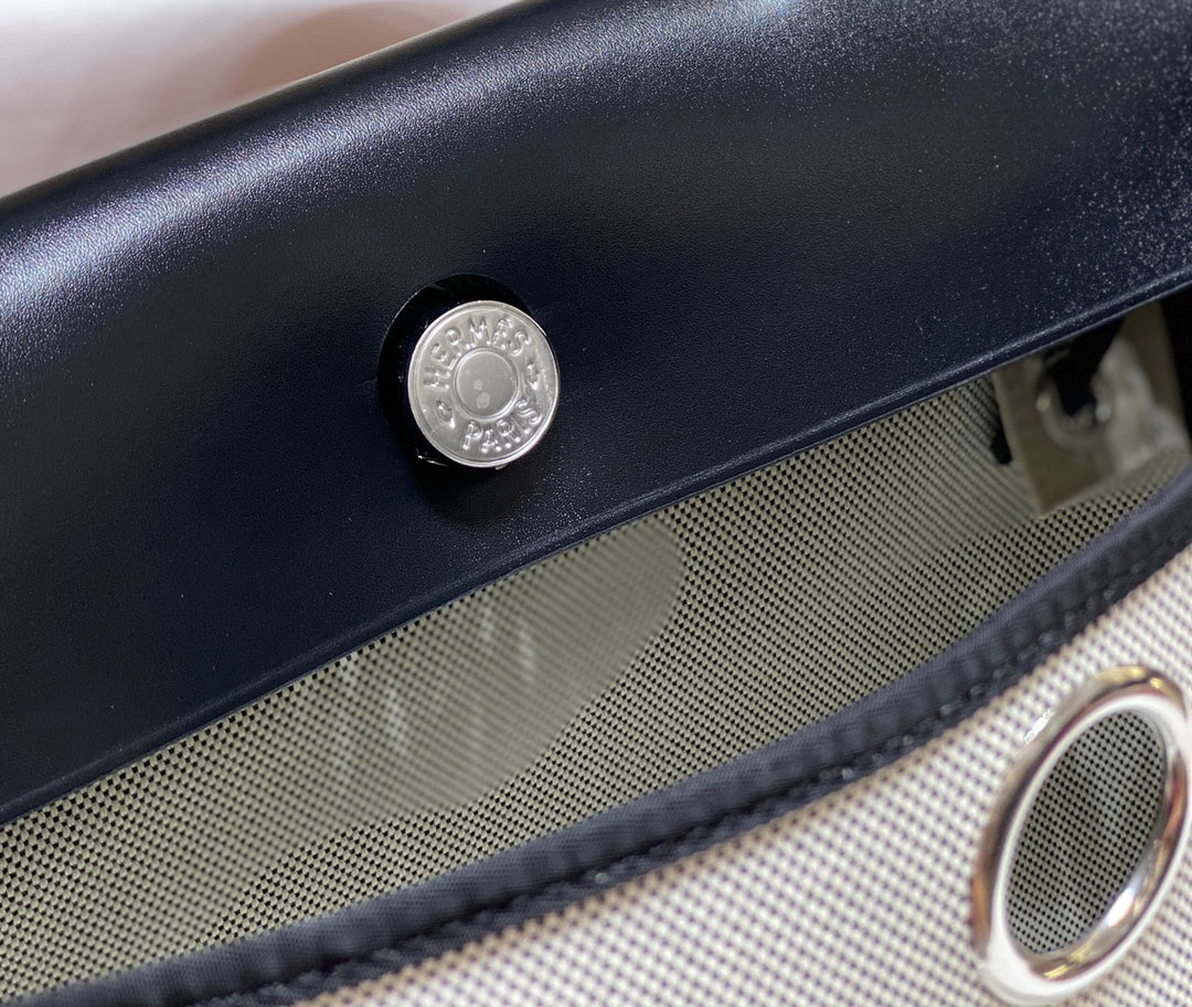 HM Pegase Pop Herbag Zip 31 White Blue Canvas Black Cowhide Leather
